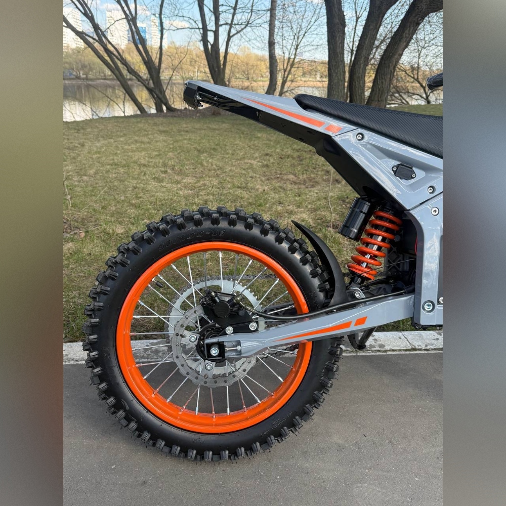 Конструкция продумана под реальные нагрузки: рама из стали и авиационного алюминия выдерживает до 150 кг, а гидравлические тормоза спереди и сзади дают полный контроль на скорости. Колёса 19/16 с внедорожной резиной обеспечивают отличное сцепление как на грунте, так и на асфальте. При массе всего 58 кг мотоцикл остаётся лёгким, манёвренным и отзывчивым — идеальный баланс между мощностью и контролем.